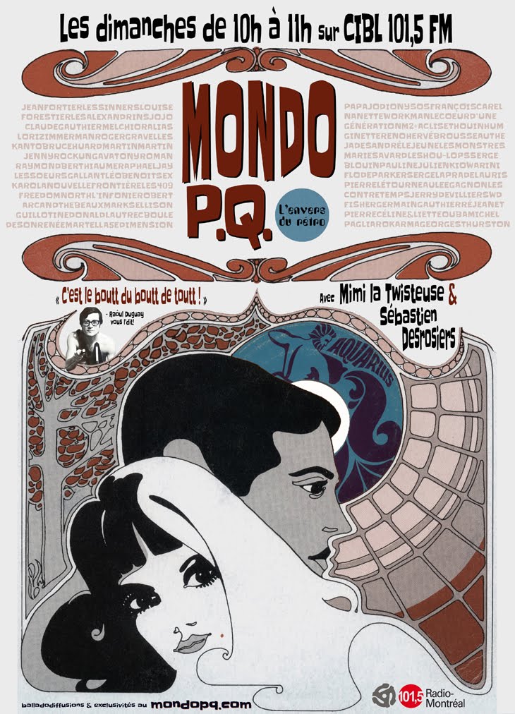 Au menu: l'envers du rétro des décennies 50, 60 et 70. Le sac à surprises déborde et Mondo P.Q. poursuit dans les mêmes sillons que ce blog en vous offrant des perles pop avant-gardistes de Montréal, du psychédélisme décloisonnant de l'Outaouais, du folk déjanté de Québec, du soul tonitruant de l'Abitibi et du rock de tout acabit! Une programmation 100% québécoise! Vous redécouvrirez des artistes et des chefs d’oeuvres oubliés, illustres méconnus ou surprises étonnantes d’artistes établis (un titre psychédélique de Serge Laprade ou le hardrock de Pauline Julien, quelqu’un?), parsemés ici et là de vignettes audio de l’époque (publicités, récits étranges, discours pédagogiques ou religieux). Une heure musicale et informative teintée d’humour et animée par deux jeunes gens passionnés de vieilles choses.